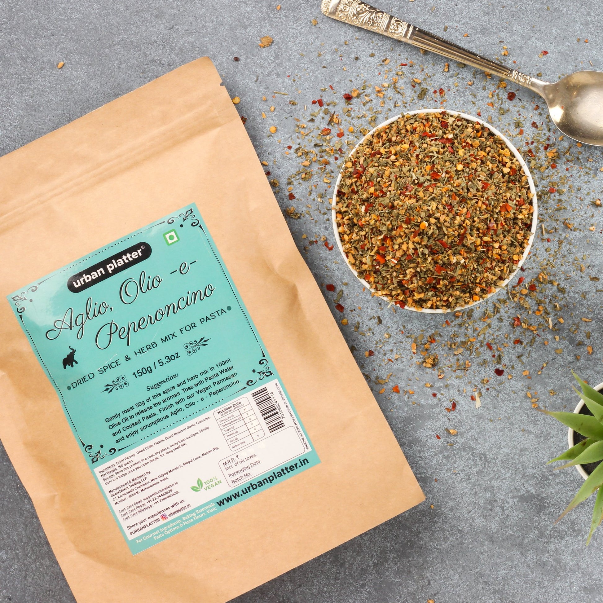 Urban Platter Aglio Olio E Peperoncino Italian Pasta Spice Mix, Dried Spice & Herb Mix for Pasta. A delicious, aromatic blend of spices and herbs, perfect for simple, classic Aglio Olio Pasta. This blend can also be added to Soups, Salads, Risotto & Pizza.