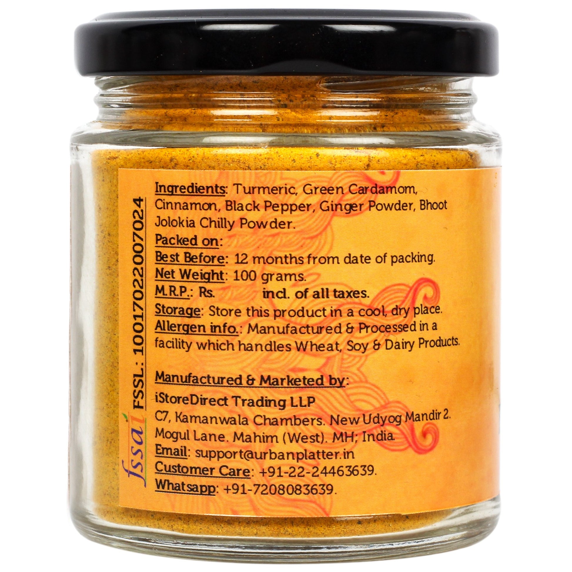 Urban Platter Golden Milk Masala is made with natural ingredients like turmeric, various spices, and Bhoot Jolokia to spice it up, Turmeric milk, even in plain form is a healthy drink it helps to nourish your body and keep you fit and energetic. Bhoot Jolokia chilly powder makes this spice blend hot and comforting along with antioxidant properties of turmeric. It can be mixed with milk or pure water served hot or cold. Prepare with hot water to reduce calorie intake.