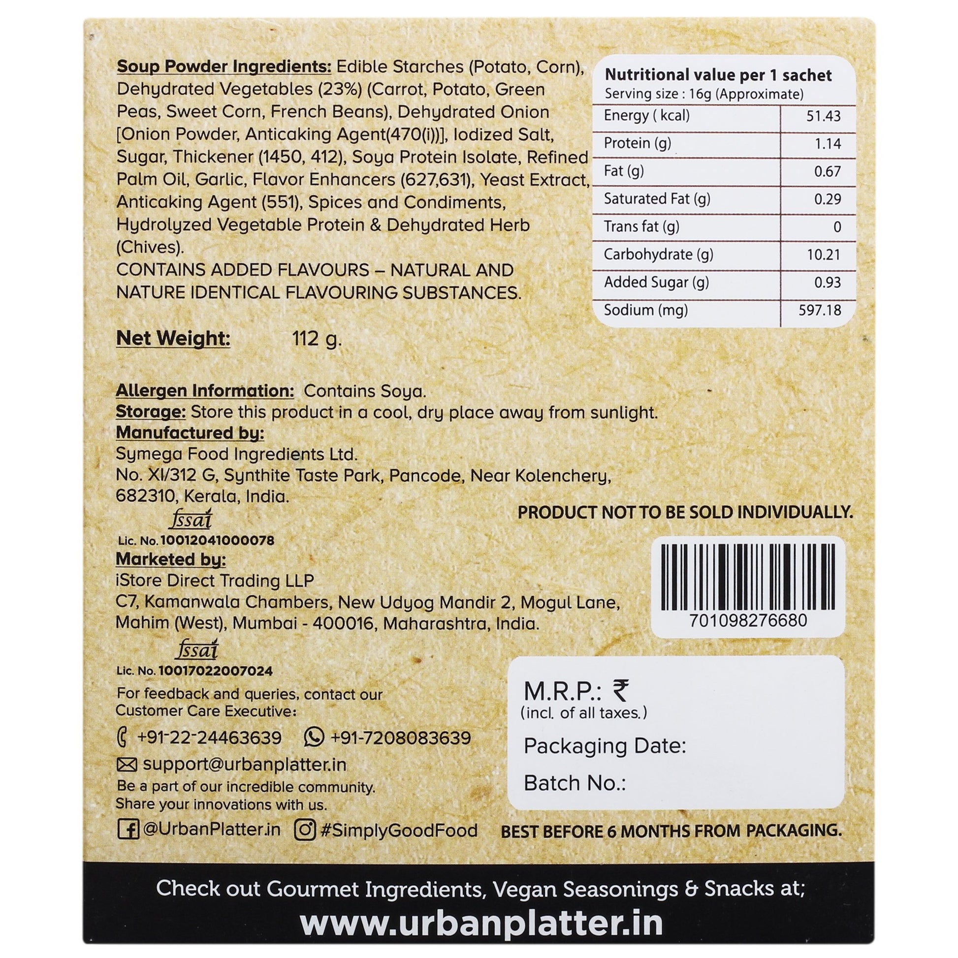 Edible Starches (Potato, Corn), Dehydrated Vegetables (23%) (Carrot, Potato, Green Peas, Sweet Corn, French Beans), Dehydrated Onion [Onion Powder, Anticaking Agent(470(i))], Iodized Salt, Sugar, Thickener (1450, 412), Soya Protein Isolate, Refined Palm Oil, Garlic, Flavor Enhancers (627,631), Yeast Extract, Anticaking Agent (551), Spices and Condiments, Hydrolyzed Vegetable Protein & Dehydrated Herb (Chives). CONTAINS ADDED FLAVOURS — NATURAL AND NATURE IDENTICAL FLAVOURING SUBSTANCES.