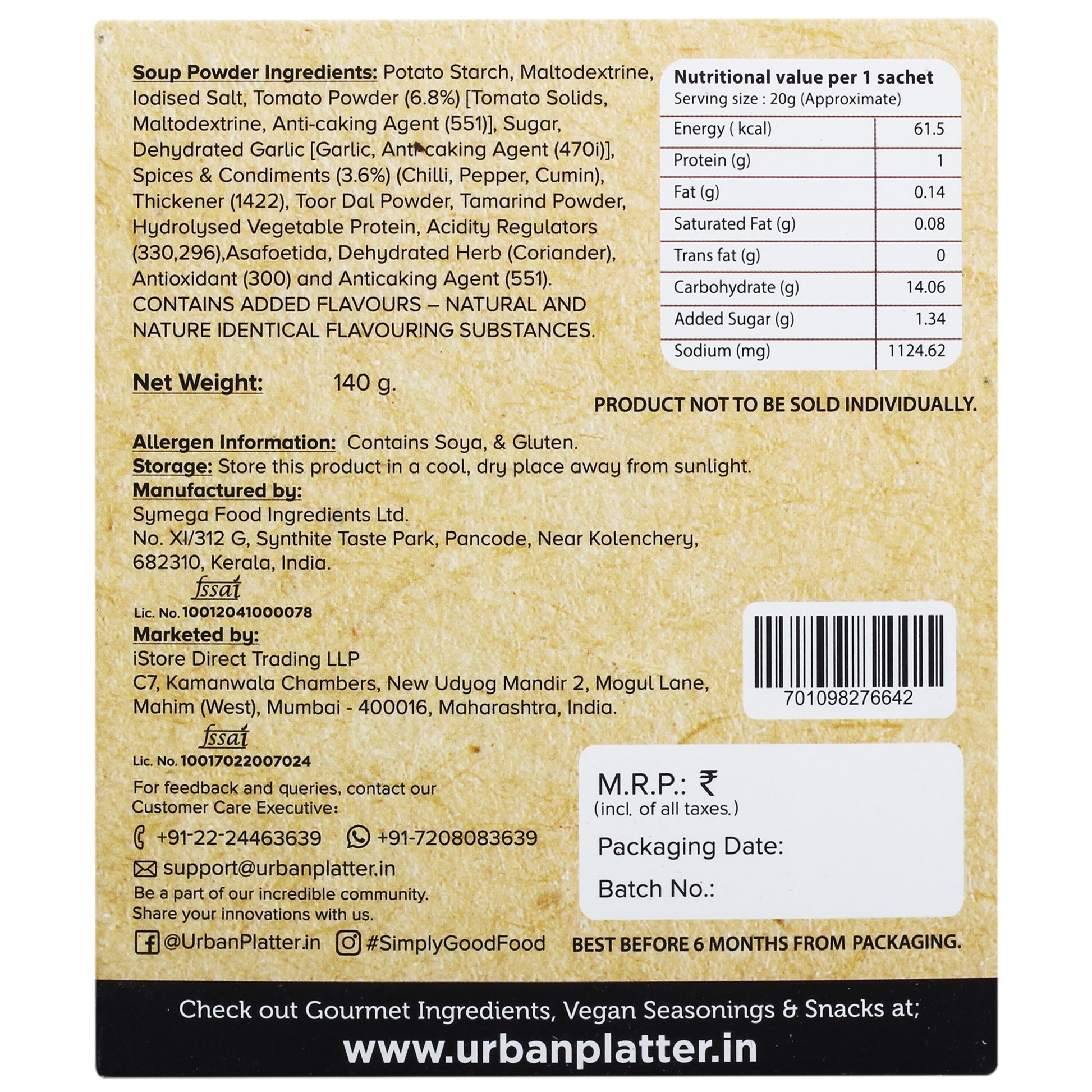 Potato Starch, Maltodextrine, Iodised Salt Tomato Powder (6.8%) [Tomato Solids, Maltodextrine, Anti-caking Agent (551)], Sugar, Dehydrated Garlic [Garlic, Anti Acaking Agent (4701)], Spices & Condiments (3.6%) (Chilli, Pepper, Cumin), Thickener (1422), Toor Dal Powder, Tamarind Powder, Hydrolysed Vegetable Protein, Acidity Regulators (330,296),Asafoetida, Dehydrated Herb (Coriander), Antioxidant (300) and Anticaking Agent (551). CONTAINS ADDED FLAVOURS — NATURAL AND NATURE IDENTICAL FLAVOURING SUBSTANCES.