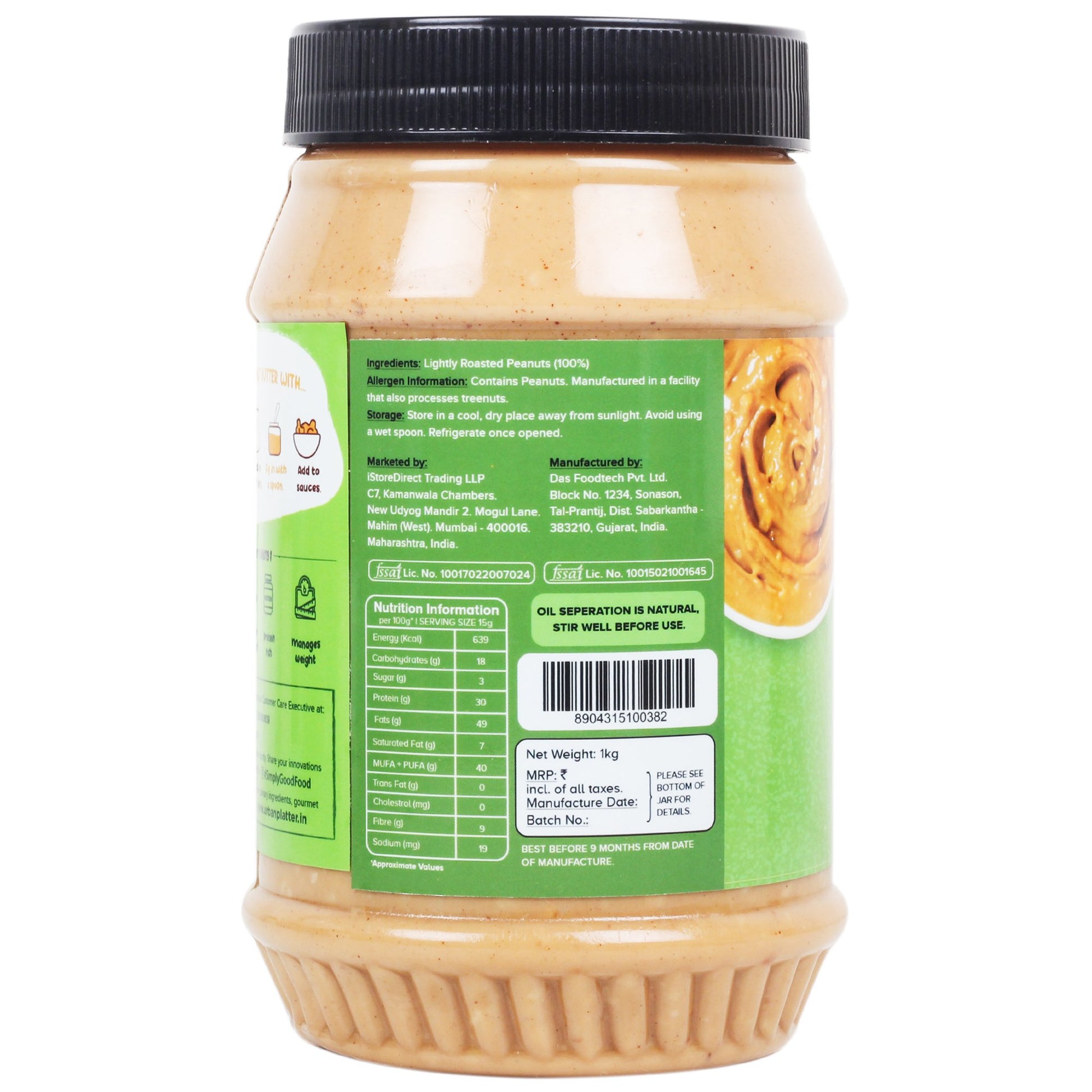Urban Platter's Unsweetened Crunchy Peanut Butter spread is made with only one ingredient that is Roasted Peanut that's all. Our Peanut Butter contains 0% cholesterol, no trans-fats, or hydrogenated fat. It is also nutritious, Rich in protein which offers instant energy post workouts. Keeping your Hunger pangs satisfied for the entire day. It's perfect for sandwiches, Stirring in a tablespoon of peanut butter in Oatmeal, Blend it up in Smoothie, Bake cookies, or simply Scoop it straight from the jar.