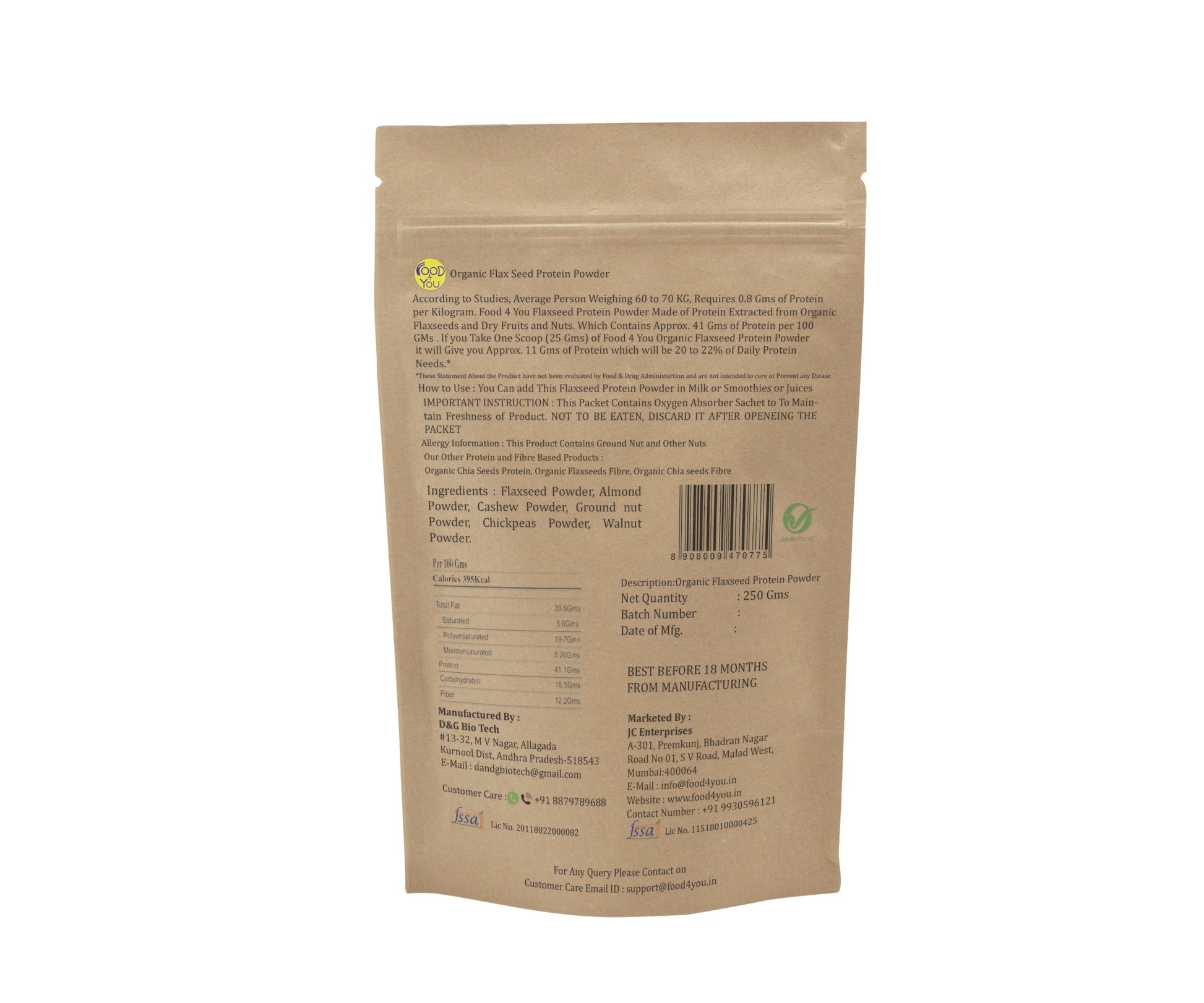 According to Studies, Average Person Weighing 60 to 70 KG, Requires 0.8 Gms of Protein per Kilogram. Food 4 You Flaxseed Protein Powder Made of Protein Extracted from Organic Flaxseeds and Dry Fruits and Nuts. Which Contains Approx. 41 Gms of Protein per 100 GMs . If you Take One Scoop (25 Gms) of Food 4 You Organic Flaxseed Protein Powder. It will Give you Approx. 11 Gms of Protein which will be 20 to 22% of Daily Protein Need.