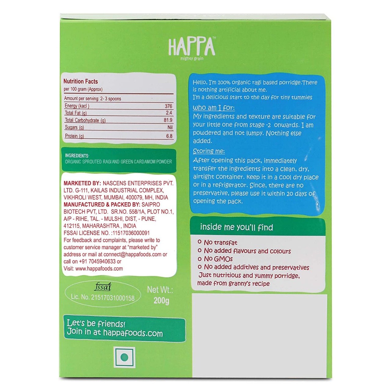 Happa Ragi cardamom porridge is made up of 100% Organic sprouted Ragi flour. Sourced from exclusive organic certified farms. Goodness of sprouted ragi Certified Organic ingredients No added Salt & Sugar No Preservatives or Additives.