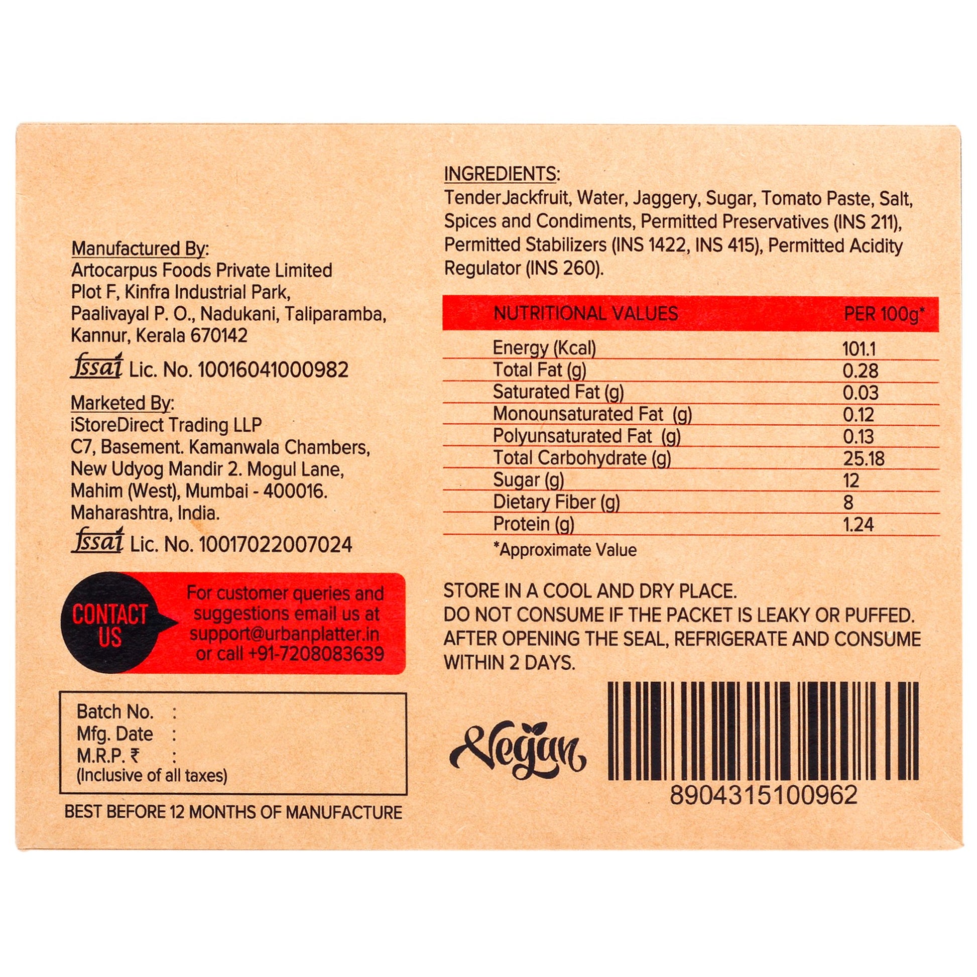Tender Jackfruit, Water, Jaggery, Sugar, Tomato Paste, Salt, Spices and Condiments, Permitted Preservatives (INS 211), Permitted Stabilizers (INS 1422, INS 415), Permitted Acidity Regulator (INS 260).