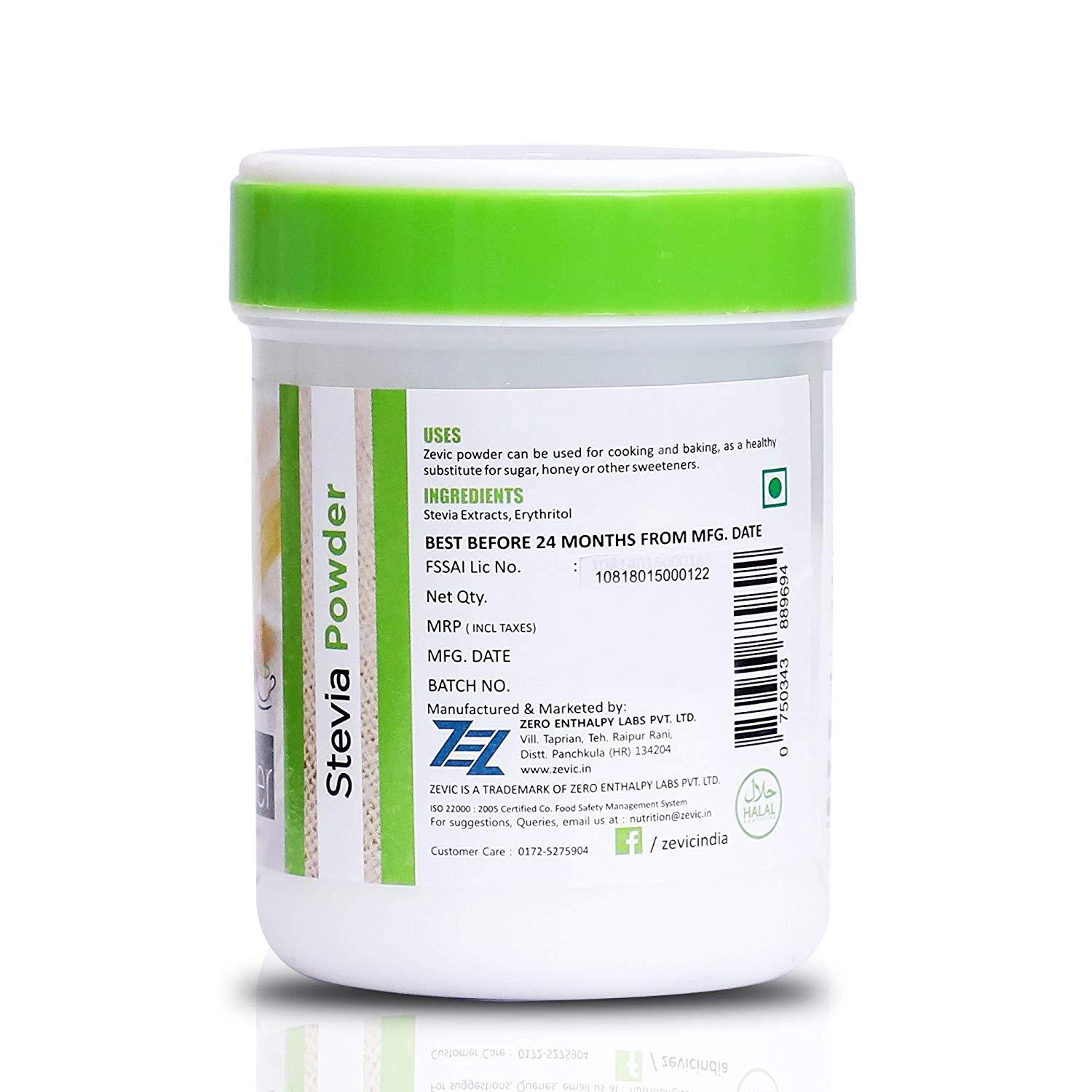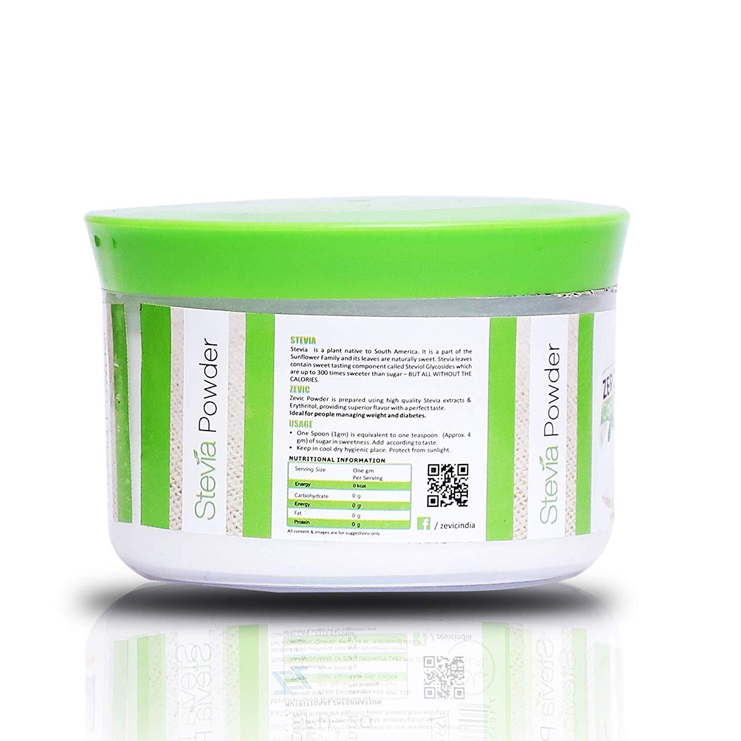 Zevic Stevia Powder has a perfect sweetness to sweeten your food & beverages taste with no after taste. Zevic Stevia powder is a perfect naturally zero calorie substitute to sugar, honey and artificial sweeteners. Zevic natural zero calorie sweeteners DO NOT contain chemicals, sucralose, lactose, dextrose, aspartame, maltodextrin etc. among many other ingredients. Since it is heat stable, it is ideal for cooking and baking. Zevic Stevia powder is perfect for usage in juices, shakes, smoothies, mocktails/cocktails etc. One spoon (provided inside) is equivalent to 1 tsp of sugar sweetness. Heat stable upto 220 ℃