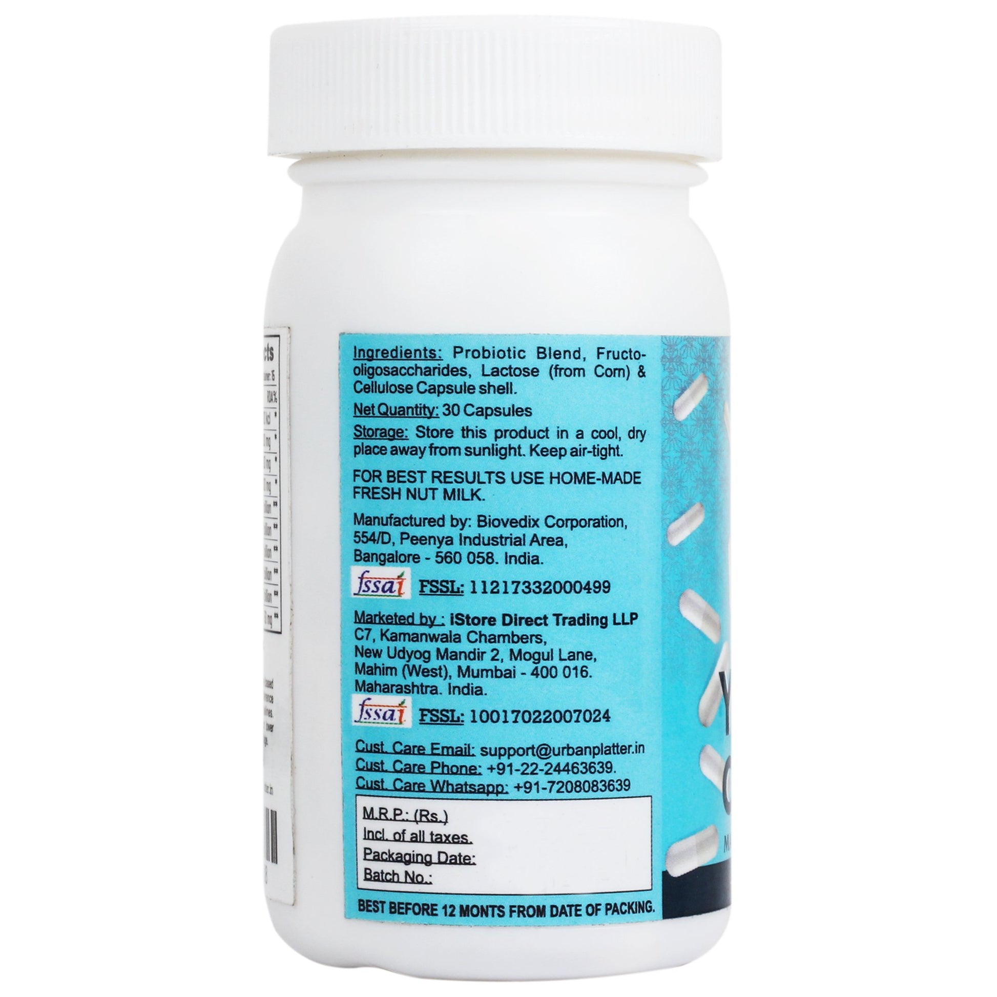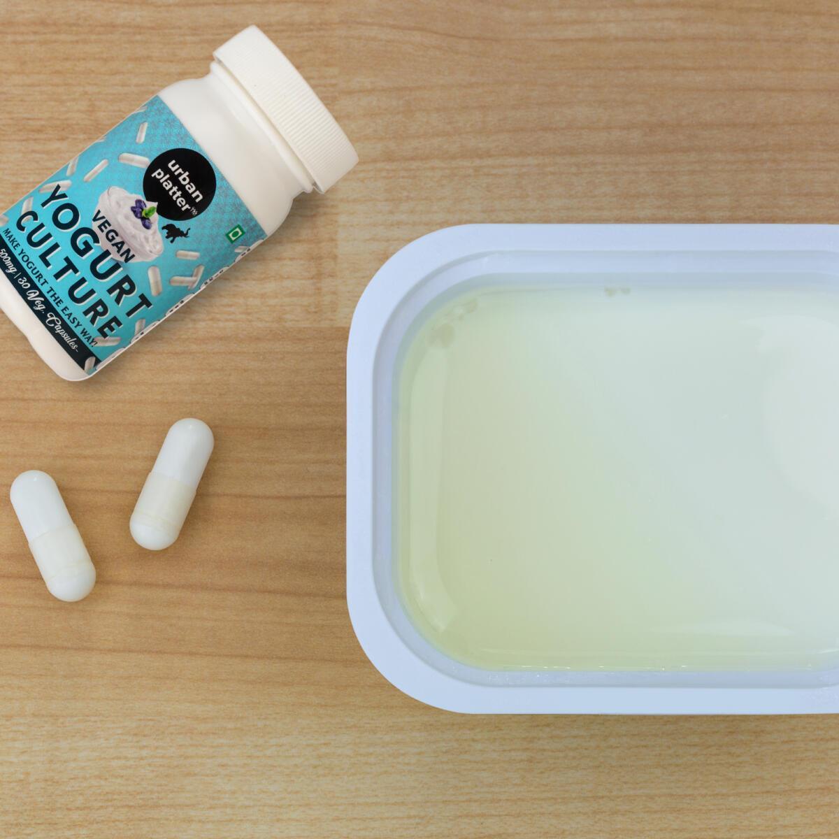 Our Vegan Yogurt Culture contains 30 capsules as each capsule make 500ml of Yogurt or can be consumed directly. Contains a blend of bacteria like Lactobacillus acidophilus, Lactobacillus Rhamnosus, Bifidobacterium Bifidum, Bifidobacterium Longum, Streptococcus thermophilus, Fructo-oligosaccharides.